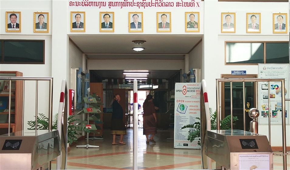 正對著圖書館入口處的墻上掛著一排相框,展示的是本屆老撾人民民主共和國中央領(lǐng)導的照片。