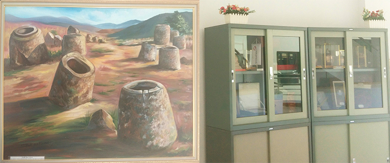 二樓樓梯拐角處掛著老撾古老寺廟油畫,旁邊的柜子里整齊擺放著幾排各國國旗;三樓樓梯拐角處掛的則是川壙省石缸平原油畫,旁邊的柜子里放置著一些老撾紀念品。