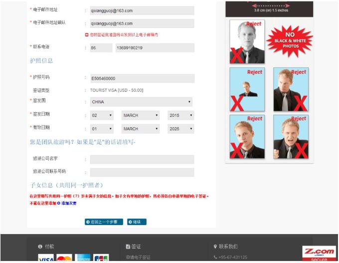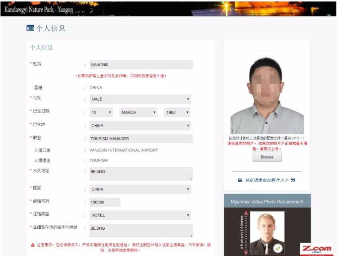這是頁面的上半部分;比較簡(jiǎn)單;名字;國籍;性別,出生日期;出生地,職業(yè),這些都按照護(hù)照的信息填寫;常駐家庭地址;國家;郵編;在緬甸的入住酒店的類型;酒店,公寓,快捷酒店;之類的選擇;酒店的名稱;還沒有預(yù)定的話,就可以上網(wǎng)預(yù)定一個(gè)可以取消的那種;很多網(wǎng)站都可以在一定時(shí)間內(nèi)取消酒店;預(yù)定一個(gè),這些酒店信息就都有了;注意,照片不能大于2M哦;