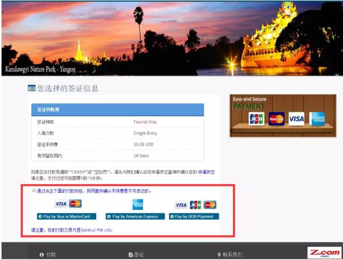最后,要繳費(fèi)了,顯示 旅游簽證,單次入境,簽證費(fèi)50美金;停留28天;同意就付款;VISA