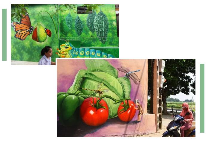 褚舍村以安全蔬菜種植業(yè)聞名,因此15幅大型壁畫重現(xiàn)了當(dāng)?shù)剞r(nóng)民的日常生活畫面,從各種農(nóng)作物、蔬菜、果園,壁畫中一個(gè)純農(nóng)業(yè)小村的畫面給參觀者帶來(lái)一種自然和美麗的視覺(jué)效果。