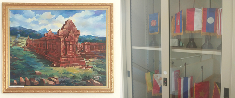 二樓樓梯拐角處掛著老撾古老寺廟油畫,旁邊的柜子里整齊擺放著幾排各國國旗;三樓樓梯拐角處掛的則是川壙省石缸平原油畫,充滿了藝術氛圍。