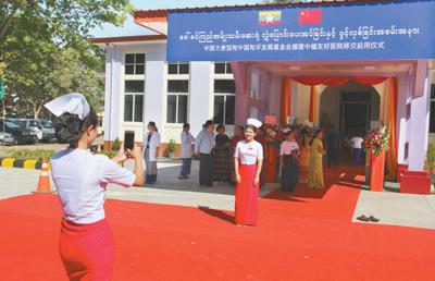 在中緬友好醫(yī)院暨杜慶芝醫(yī)院移交啟用儀式上,醫(yī)院護(hù)士在醫(yī)院門口拍照留念。